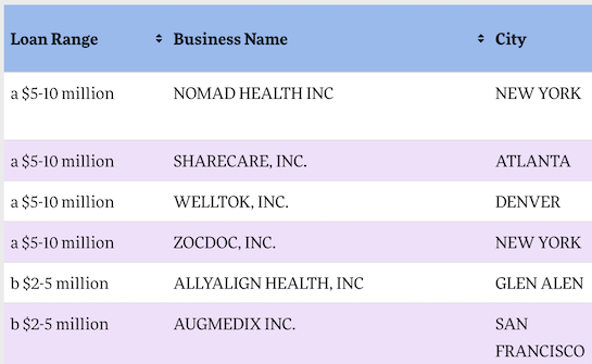 So far, Lark and BrightMD have told me that they did not end up taking the loan, while Wildflower Health confirmed that they did. Zocdoc told another publication that they did execute the loan, but then they returned the money. Zocdoc, however, have yet to get back to me to confirm that.