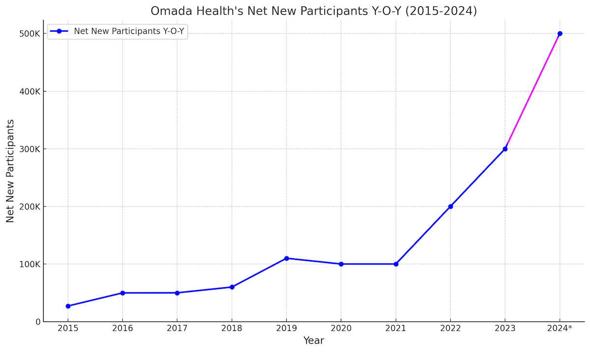 2024 revenue caveat: The big asterisk for the 2024 data point is that this number is based on a highly speculative number of new participants for 2024. As noted above, Omada hasn’t disclosed a cumulative participants number since October 2023 when it hit the 1 million milestone. Considering Omada’s recent trendline of adding a couple thousand new participants year-over-year plus the rise of GLP-1s and the apparent success of EncircleRx (maybe contributing 320,000 or more net new participants), adding around 500,000 new participants in 2024 seems like a fair estimate.