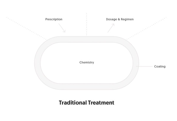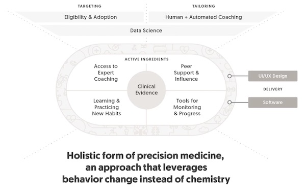 This view has been something of a fixture in digital therapeutics. Here are two images from a presentation that Omada Health’s CEO and co-founder Sean Duffy gave back in late 2017. (This YouTube link should be cued up right to this section of his talk.) First, Duffy showed a simple diagram of a traditional pharmaceutical. The diagram shows “chemistry” inside the pill and the “coating” on the outside: