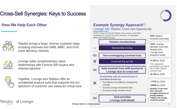 Teladoc and Livongo filed an S-4 statement outlining many details related to their impending merger, and the companies also revealed more of their thinking in a presentation to investors this week. Here are some highlights, including the breakup fees each would have to pay if the deal goes south, first from the S-4:
