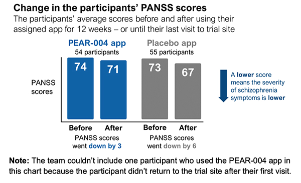“Did the PEAR-004 app lower the severity of the participants’ schizophrenia symptoms? The participants who used either app had lower severity of schizophrenia symptoms by the end of this trial. The clinical trial team concluded that the PEAR-004 app did not have a meaningful effect.”