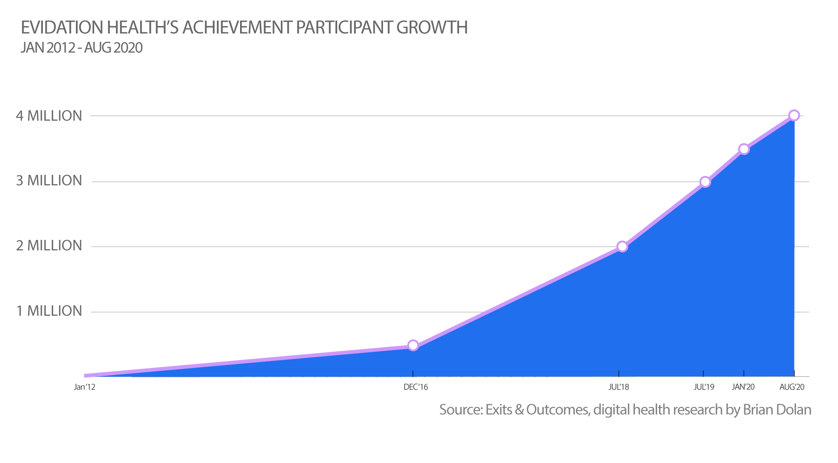 As noted above, throughout Evidation’s many twists and turns one of the programs the company has consistently offered is its Achievement platform. While The Activity Exchange launched Achievemint back in 2012, it wasn’t until the end of 2016 that the platform clocked more than 500,000 participants. That number hit 2 million by mid-2018 and is right around 4 million today.