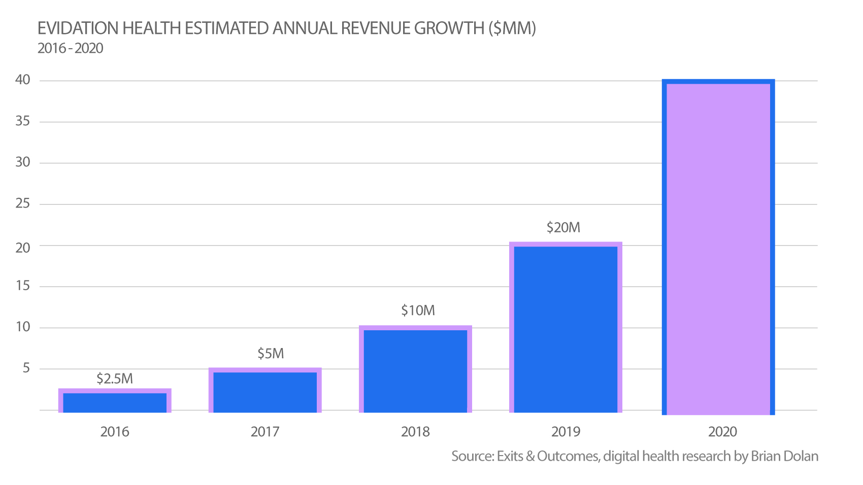 Officially, Evidation Health has kept its revenue figures quiet. What follows is a rough estimate of annual revenues for Evidation during its “digital measures” company years (2016 through 2020). It is based on a few sources of information, which I’ll spell out here so you can decide how seriously to take these estimates: