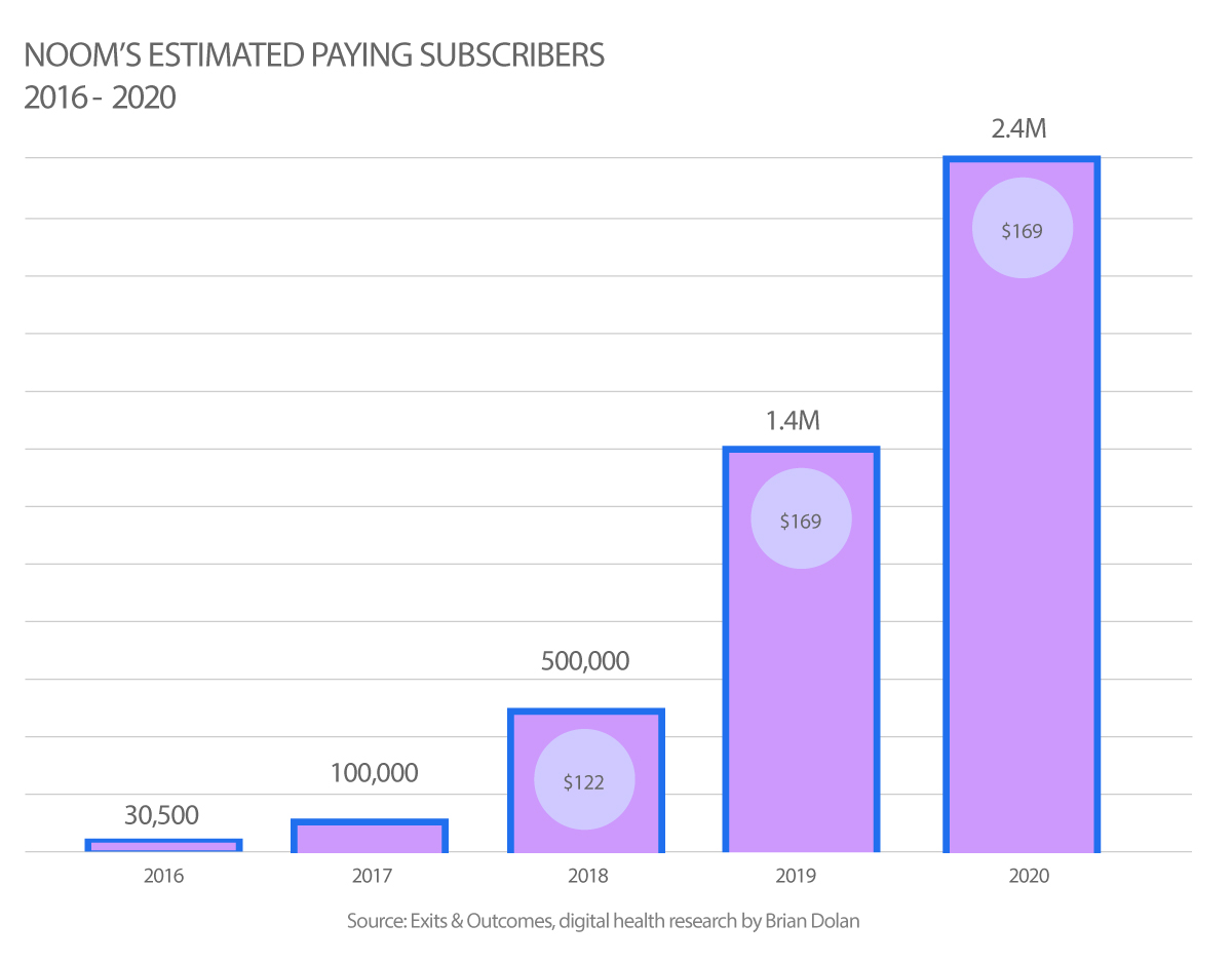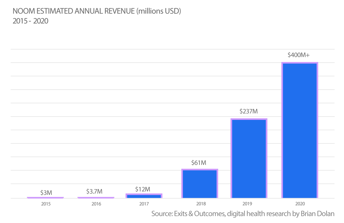 UPDATE: After this report went live, Deloitte published its list of 500 of the fastest-growing private tech companies. The list included Noom with a 3,052 percent growth between 2017 and 2020. While Deloitte doesn’t disclose actual revenue numbers, the percent growth figure is a very helpful number because we know Noom brought in $12 million in revenue for 2017. As mentioned above, Noom has only ever given a rounded-off number for its 2020 revenue figure, which it usually says was around $400 million. I previously assumed the company was rounding down, but if Deloitte’s 3,052 percent number is accurate then Noom was rounding up. Its 2020 annual revenue was more like $378 million if the math all holds.