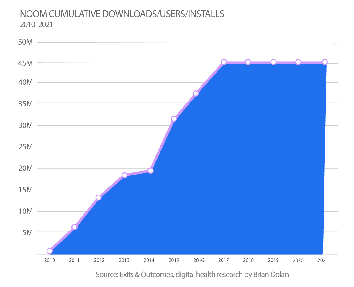 Are they “users” or “downloads” or “installs”? Over the years Noom has used different units when sharing their big number. In the early years the company typically called them downloads, but then switched to “installs” for most of 2015 when the figure had already hit 32 million. Ever since 2016 Noom has almost always referred to “users” as the unit attached to the big number.