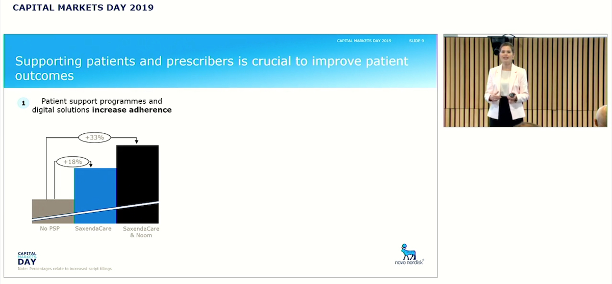 “Where you see we can support patients is on adherence. Right now the stay time with Saxenda is four to five months. That is, of course, not very long. We have seen from studies that when we combine Saxenda with SaxendaCare and we combine it with other behavioral modification programs like Noom like you see here, we are actually able to increase the stay time at the adherence at 33 percent. That means that behavioral modification at obesity along with weight loss products actually gives an even longer stay time and with that an even stronger ability to lose weight.”