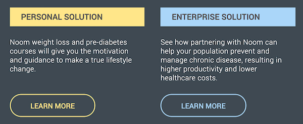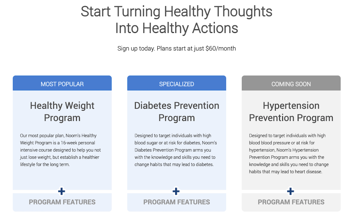 2016: As of May 2016, Noom began marketing its prevention programs directly to consumers, while reserving chronic condition management programs for its B2B clients. This marked a dramatic shift in positioning on Noom’s website. Pricing went up (programs start at $60 a month at this time) and healthcare programs gain equal prominence with its flagship weight loss program.