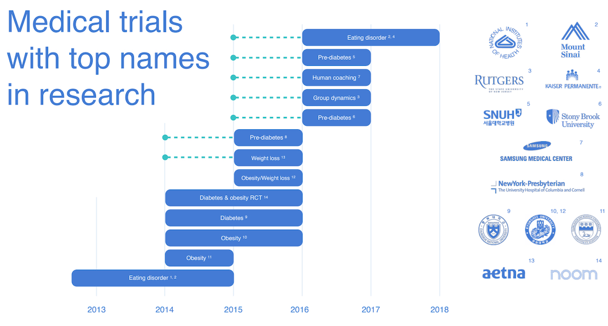 In 2016 while Noom pitched investors to drum up support for its big pivot into B2B digital health, it laid out its past and ongoing clinical trials in this slide: