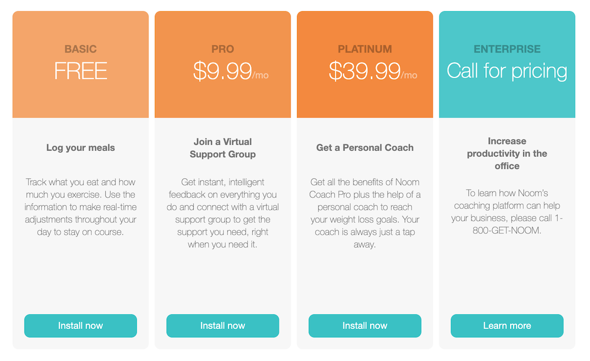 2018: By 2018 Noom has settled on a direct-to-consumer pricing strategy that it (more or less) sticks with up through the present. Plans for its weight loss program run: